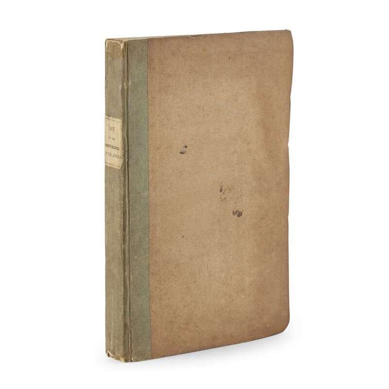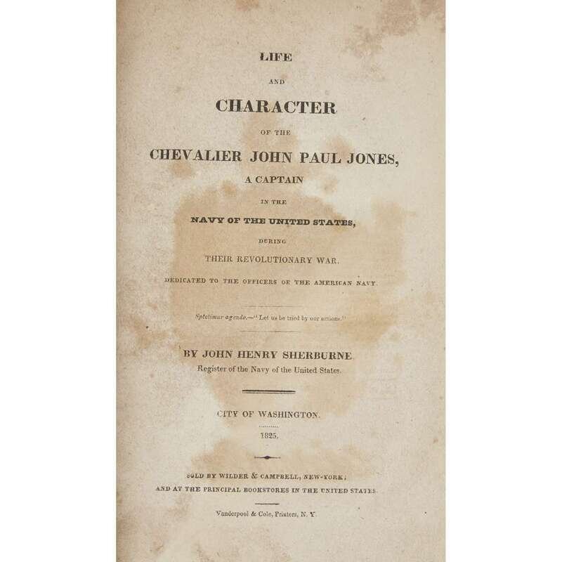 City of Washington: [United States Navy] 1825. First edition. 8vo. Publisher's two-toned blue and brown paper-covered boards with white paper spine label lettered in black, scattered soiling to boards, wear and bumping to extremities, minor loss to spine ends, front hinge starting at bottom edge, tide mark from prelims through p. 17 affecting the frontispiece and title, tide mark also from approx p. 347 through rear board. Illustrated with an engraved frontispiece portrait of John Paul Jones by C. W. Peale. Howes S393.