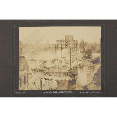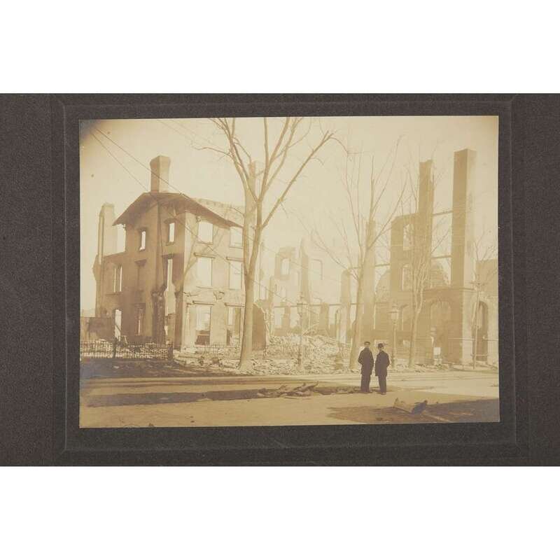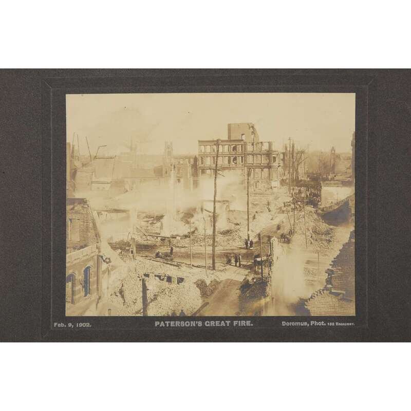 1902. Eight cabinet cards (from a set of 31) documenting the aftermath of the February 9, 1902 Great Fire, and eight cabinet cards (from an undetermined numbered set) of the March 2, 1902 Great Flood. From the Doremus Photography Studio, Paterson, New Jersey. Condition varies, scattered notation to versos, one image with pencil markings on recto. Each card:10 x 12 in. (25 x 30cm). Each image: Approxiametly 6 x 8 in. (15 x 20cm).