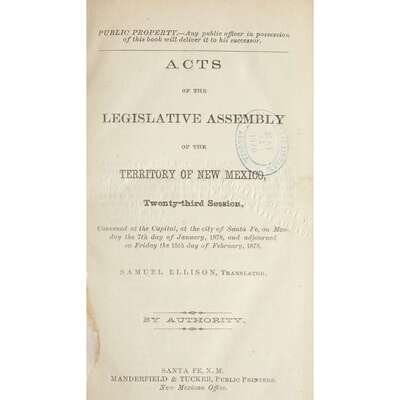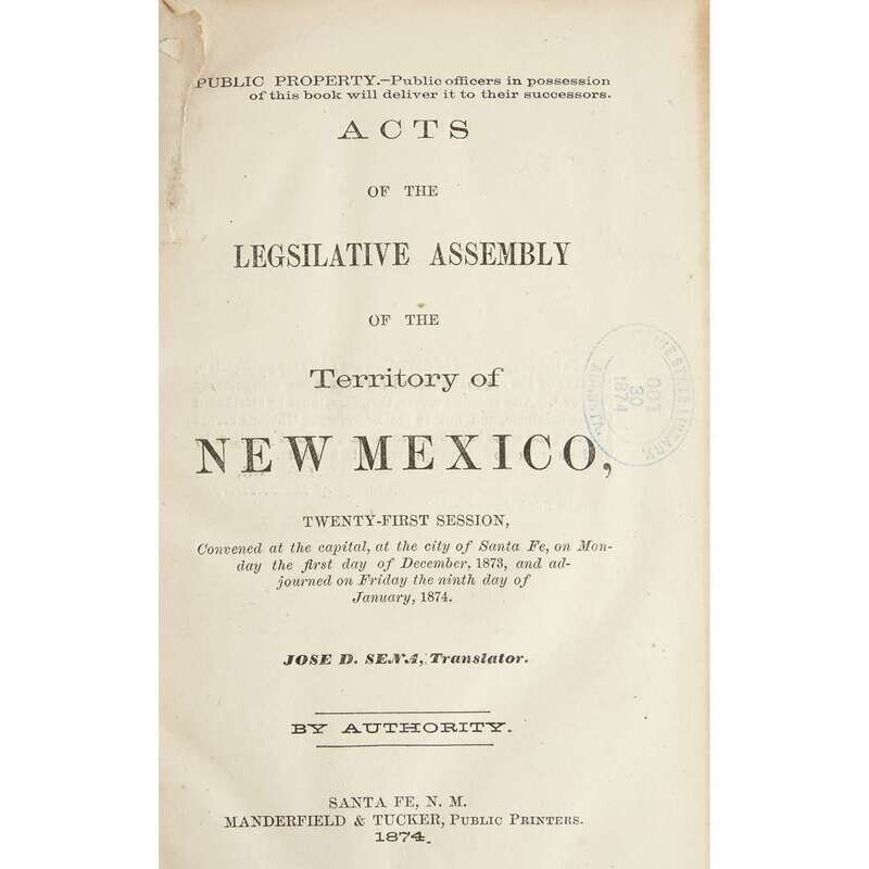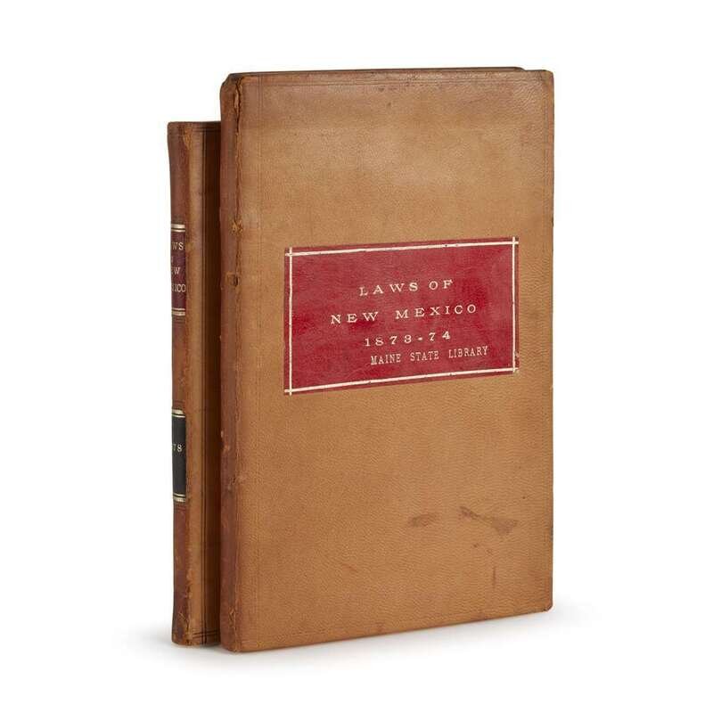 Acts of the Legislative Assembly of the Territory of New Mexico, Twenty-First Session...1873...1874. Santa Fe: Manderfield & Tucker, 1874. 8vo. (3)-127(1), (1)-31pp. Early 20th century sheep, scuffed, extremities rubbed; red morocco cover label. Ex-library with label on front paste-down, ink stamp on title-page and front free endpaper recto. And Acts of the Legislative Assembly of the Territory of New Mexico...1878 Santa Fe: Manderfield & Tucker, (ca.1878). 12mo. (3)-128pp. Early 20th century sheep, slightly scuffed; morocco spine labels. Small repairs to title-page. Ex-library with ink stamps on front paste-down, title-page, and front free endpaper recto, blind stamp on title-page.