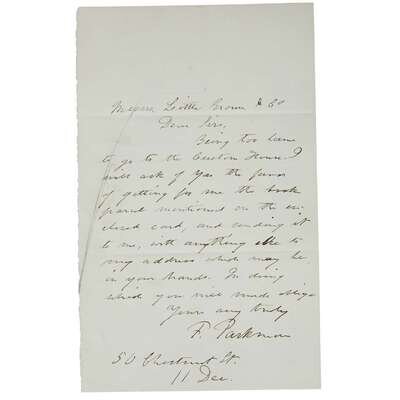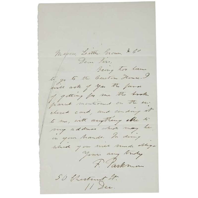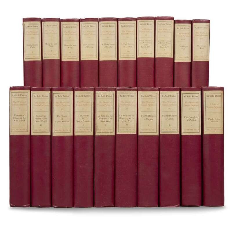 Boston, 1902. In 20 volumes. #1 of 500 numbered sets. 8vo. Illustrated with portraits and plates. Bound in burgundy cloth with paper spine labels; top edges gilt, other edges untrimmed; frontispiece in first volume loose. A near-fine set. An A.L.s., addressed to his publisher, laid in: “ Messrs. Little, Brown, & Co/Dear Sirs,/Being too lame/to go to the Custom House, I/will ask of you the favor/of getting for me the books/parcel mentioned on the en-/closed card, and sending it/to me, with anything else to/my address which may be/in your hands. In doing/which you will much oblige/Yours very truly/F. Parkman/50 Chestnut St./11 Dec.” Parkman died in 1893 so clearly this letter, addressed to his publishers, refers to a different set of books. The number “1” on the limitation page does lead one to suspect it was a copy presented to his family but that is only speculation.