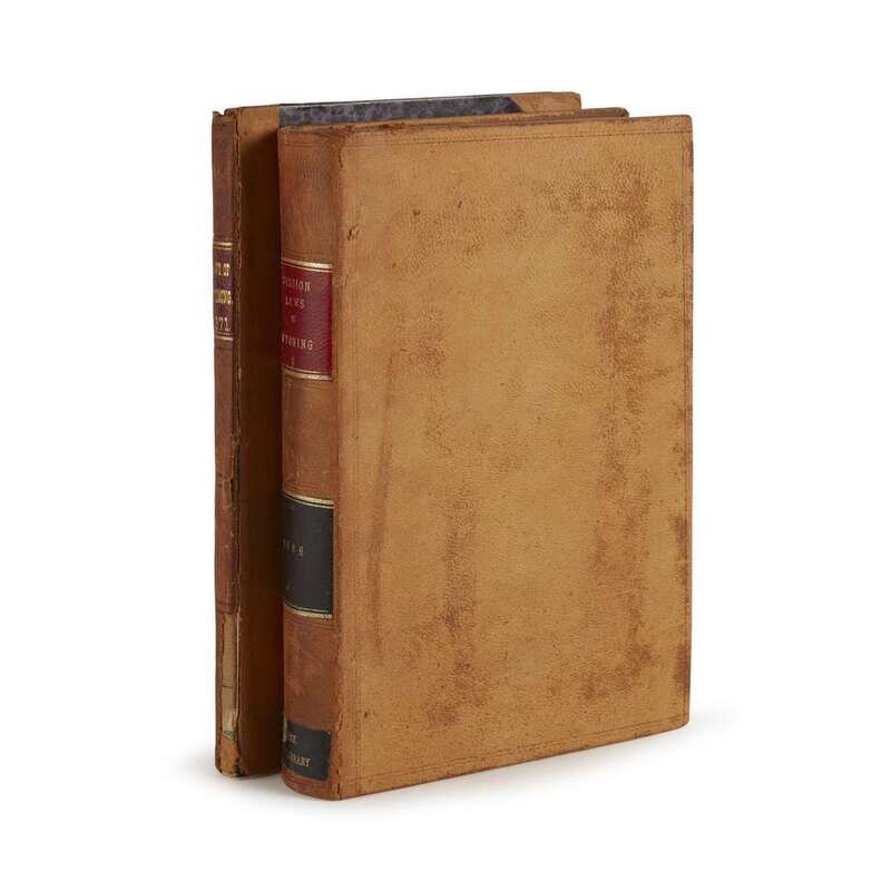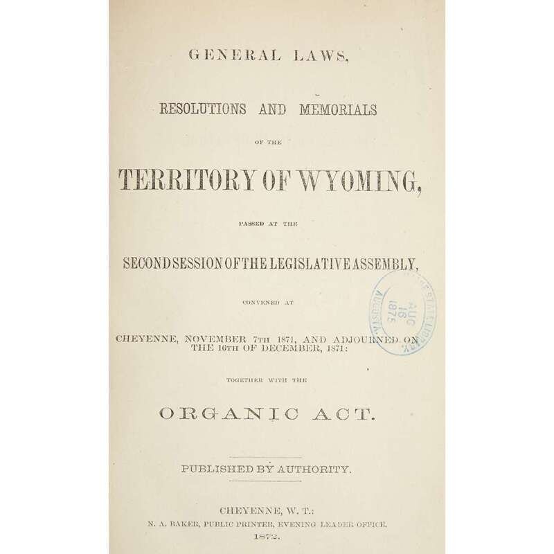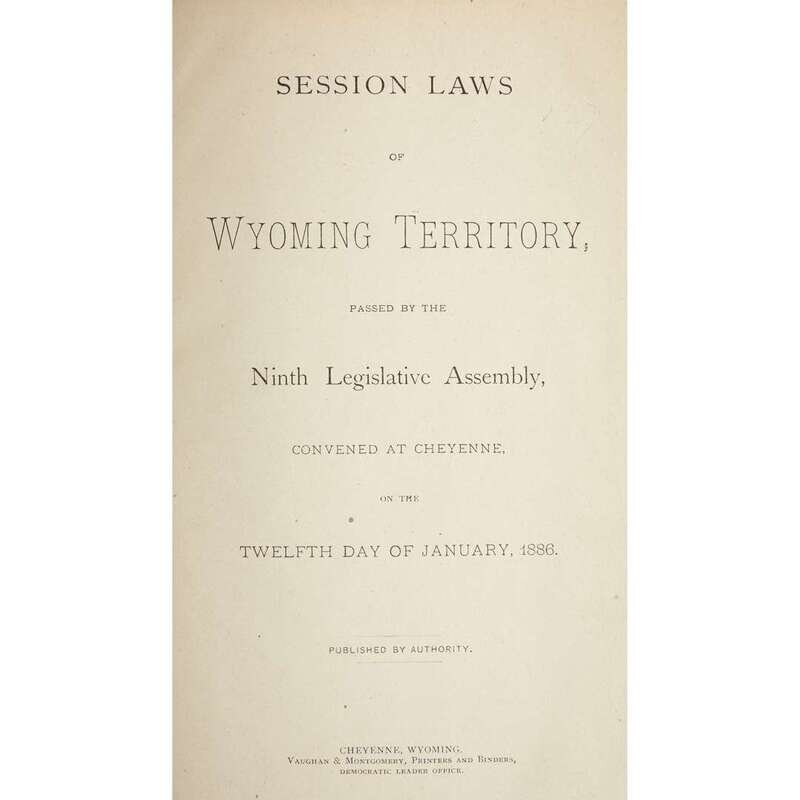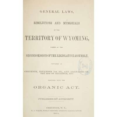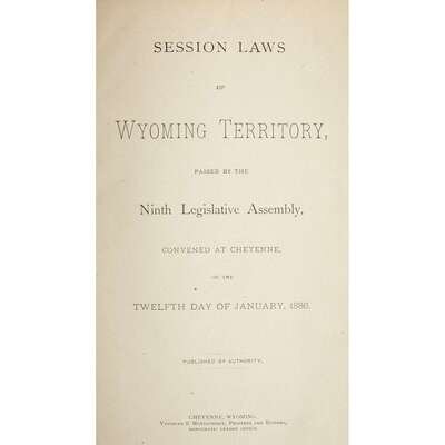 General Laws. Resolutions and Memorials of the Territory of Wyoming, passed at the Second Session of the Legislative Assembly Cheyenne: N. A. Baker, 1872. 8vo. (i-vi), (7)-147pp. Later half sheep over marbled boards, joints and extremities rubbed, front joint starting; morocco spine label. With the printed presentation label of G.W. French, Secretary Wyoming Territory on front paste-down. Ex-library with label on front paste-down and ink stamp on title-page. Session Laws of Wyoming Territory, passed by the Ninth Legislative Assembly...Twelfth Day of January, 1886 Cheyenne: Vaughn & Montgomery, (1886). 8vo. (i)-xiv, [2], (1)-475, [3], (1)-67pp. Later sheep, scuffed; morocco spine label. Edges of endpapers darkening. Ex-library with label on front paste-down.