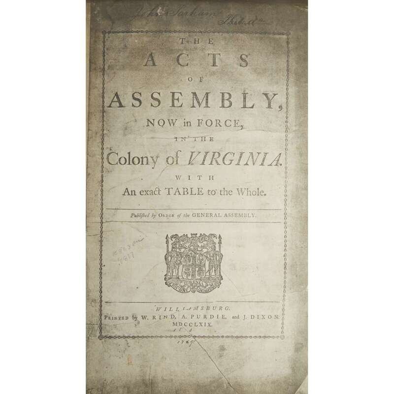 (Williamsburg: W. Rind, A. Purdie and J. Dixon, 1769). Folio. Early brown sheep, re-backed in first half of 20th century; new corners and endpapers (restored sometime early 20th century). Title-page and pp. 1-12 supplied in facsimile, tape repairs to pp. 13-16, toning and spotting, scattered chipping to margins, occasional dampstaining. Index at rear defective and incomplete, lacking pp. 561-577. Evans 11511.