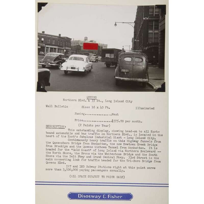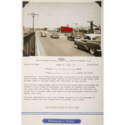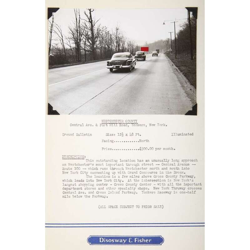 New York, 1955-1958. Five volumes from the Disoway & Fisher Outdoor Advertising firm, showcasing billboard space for rent throughout New York City and its environs. Illustrated with numerous mounted gelatin silver prints and other photographic reproductions. Original grey presentation folders as used by the firms sales representatives; stamped in blue. Condition varies.