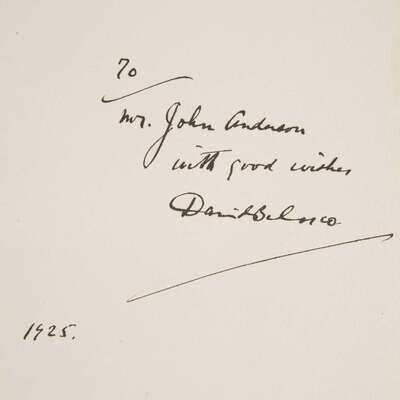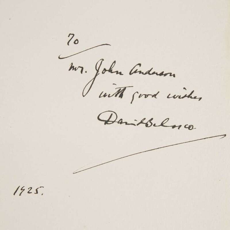 (New York, 1925). The English Version, by H. Granville Barker; produced by Belasco. 4to. Inscribed by Belasco in ink on first free endpaper, "To/ Mr. John Anderson/ with good wishes/ David Belasco/ 1925". Illustrated with 34 photographs. Original grey wrappers over stiff boards, rear panel flap separated from board, small chipping along top edge; stamped in dark grey.