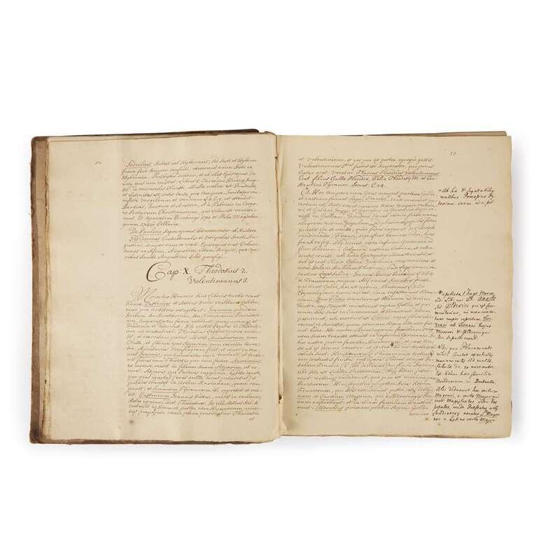 (Europe, ca. early or mid 18th century). In four volumes. 4to. 2-408; 409-825; 1-392; 393-415, 1-243 (paginated in contemporary ink). 18th century calf, rubbed, worn, blistered, covers detached or detaching, bindings breaking or starting. Scattered dampstaining to text. Armorial bookplate on front paste-down of each volume.