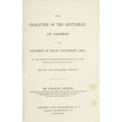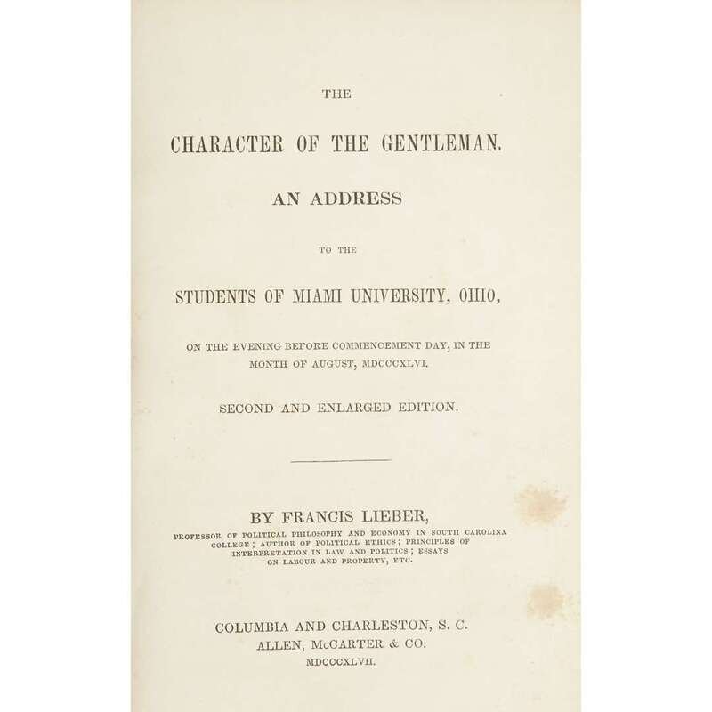 [Autographs & Manuscripts] Lieber, Francis The Character of the Gentleman. An Address to the Students of Miami University, Ohio
