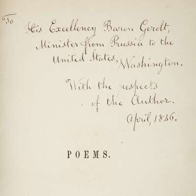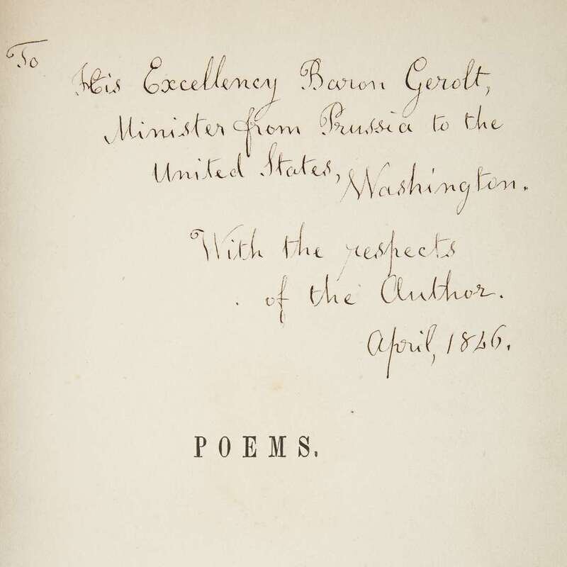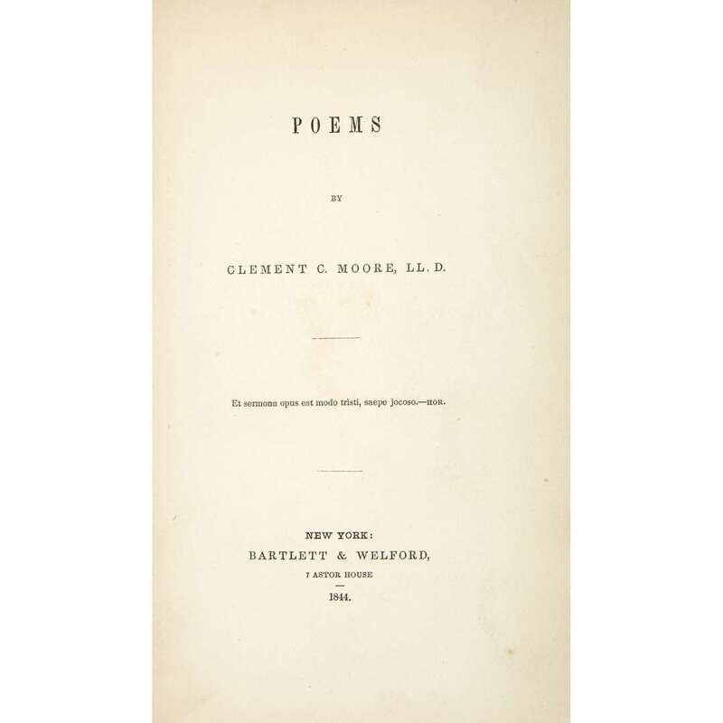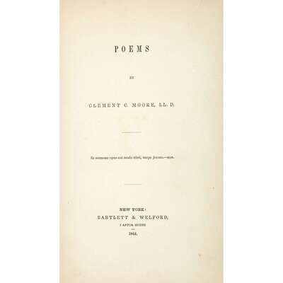 Bartlett & Welford, 1844. First edition. 12mo. Untrimmed, (leaf size 7 1/4 x 4 1/2 in.; 185 x 114mm.) (i)-(xiv), (15)-216pp. Presentation copy of the first printing in book form of “A Visit From St. Nick,” commonly known as “‘Twas the Night Before Christmas," and inscribed on the half-title, “To/His Excellency Baron Gerolt/Minister from Prussia to the/United States/Washington/With the respects/of the Author/April, 1846." With half-title, original endpapers, and rear fly lea; lacking front fly leaf. Publisher's dark brown paper boards, minor wear to the original boards; rebacked with modern dark brown paper and printed paper spine label; in brown quarter calf over tan cloth slipcase and cloth chemise. Leather book plate of E.H. Mills on front paste-down. BAL 14348.