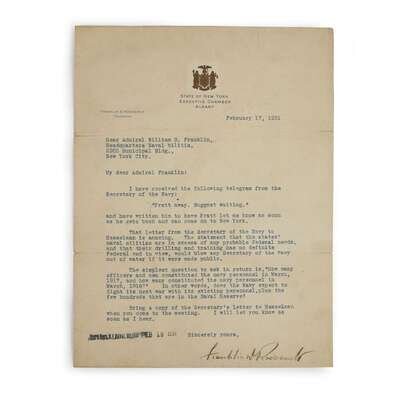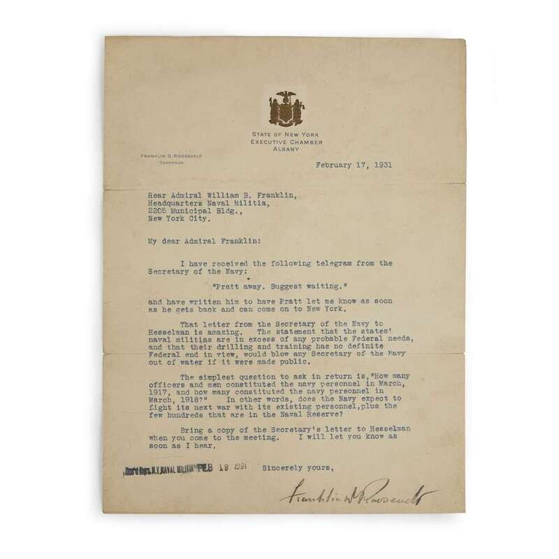 Albany, New York. February 17, 1931. 1p. 4to. To Rear Admiral William B. Franklin, "I have received the following telegram from the Secretary of the Navy: 'Pratt away. Suggest waiting...' The letter from the Secretary of the Navy to Hasselman is amazing. The statement that the states' naval militias are in excess of any probable Federal needs...would blow any Secretary of the Navy out of the water if it were made public...does the Navy expect to fight its next war with its existing personnel, plus the few hundreds that are in the Naval Reserve?" On State of New York, Executive Chamber letterhead. Slightly dusty, backed on heavy paper sheet. Provenance: Charles Sessler receipt, dated 2,11, [19]46.