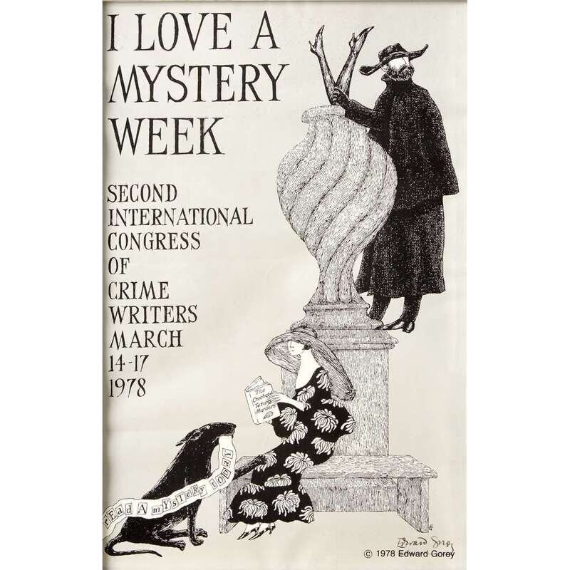 Original poster for the Second International Congress of Crime Writers, March 14-17, 1978. Signed by Gorey in ink at bottom right corner. 15 x 10 in. (38 x 25 cm). Framed.