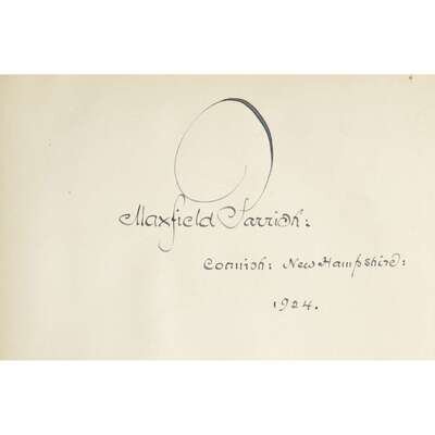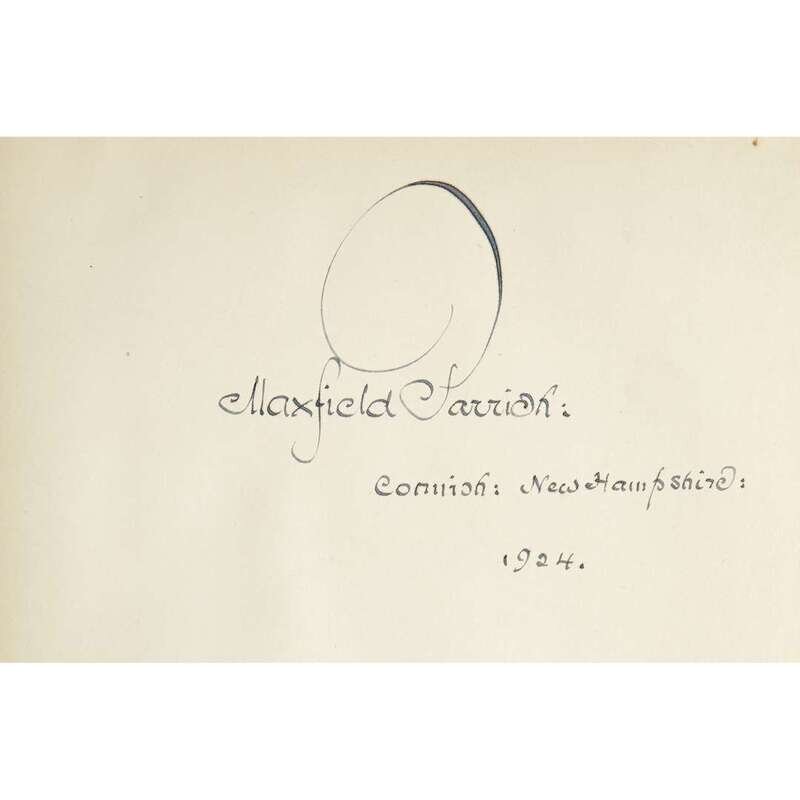 New York: Charles Scribner’s Sons, 1923. Reprint. Inscribed by Parrish on recto of first free leaf: “Maxfield Parrish:/Cornish: New Hampshire:/1924.” Publisher’s brown cloth, stamped in gilt, lightly worn; illustrated label pasted on upper board, worn and scratched; illustrated endpapers; top edge trimmed, other edges untrimmed.