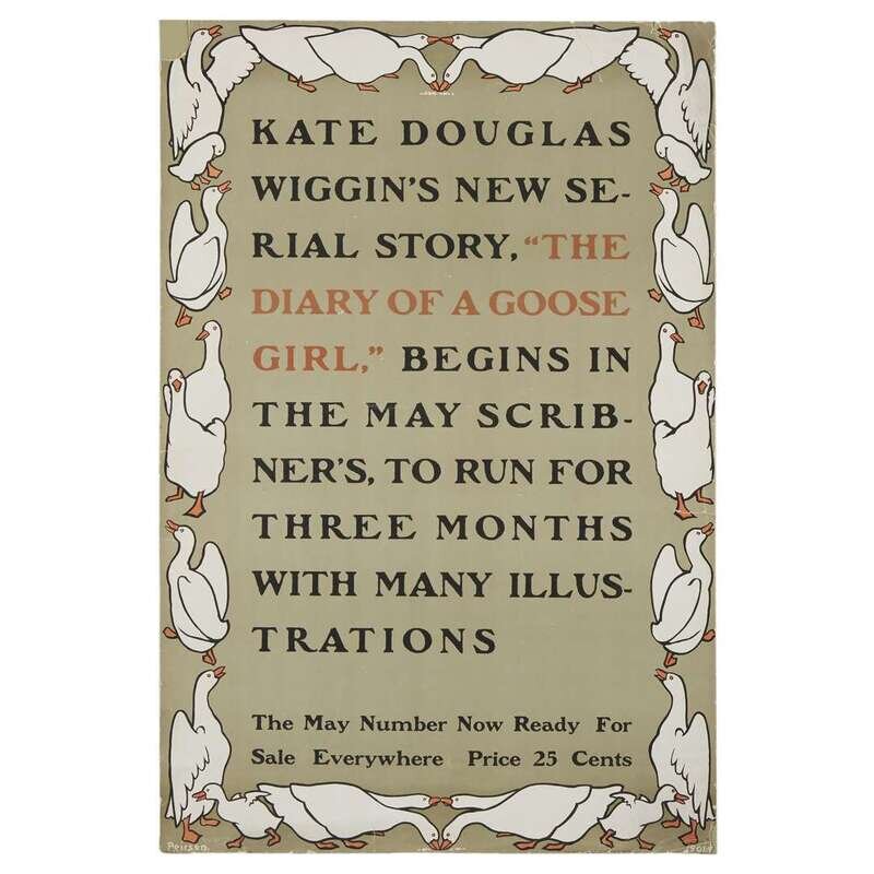 Ca. May, 1901. Color lithographic poster by Peirson for Wiggin's The Diary of a Goose Girl. Condition B-: two corners repaired; scattered repairs to edges with tape on verso, other tape residue on verso; scattered creasing and edge-wear.