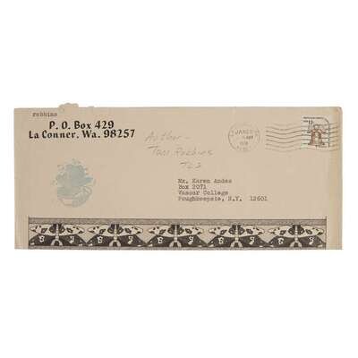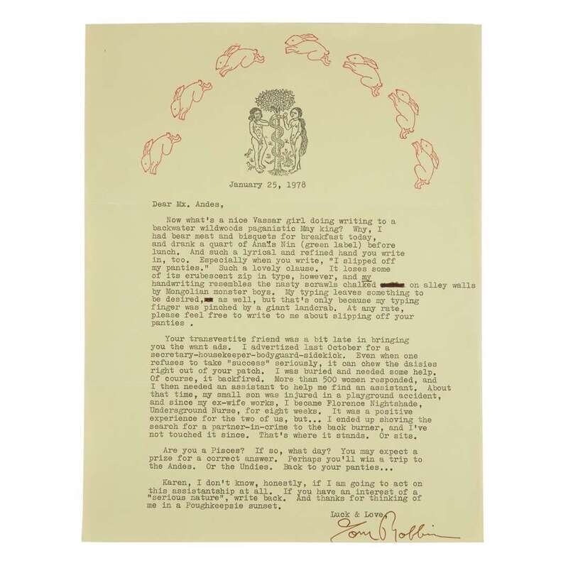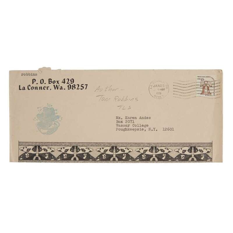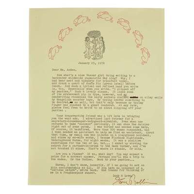 January 25, 1978. 1 p. 8 ½ x 11 in. To a Mx. (sic) Karen Andes from Robbins on his yellow print-embellished stationary, with original mailing envelope. Signed by Robbins in brown ink, creasing from old folds.