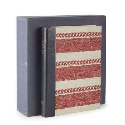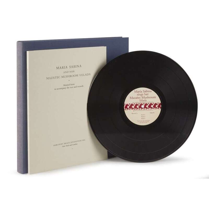 New York and London: Harcourt Brace Jovanovich, (1974). Ethno-mycological Studies No. 3. First and limited edition, #XI of L copies printed for private circulation (of 250 total copies). Gift copy printed for Stella Kramrisch. Illustrated with numerous in-text and full-page plates and photographs. Publisher's quarter blue morroco over red and beige pictorial patterned cloth; stamped in gilt; top edge gilt, other edges untrimmed; including four lp records in original sleeves with accompanying limp grey wrapper musical score in publisher's clamshell case, records not played, spine sunned; stamped in gilt; both housed in publisher's two compartment slipcase, sunned. Near-fine/ fine condition.