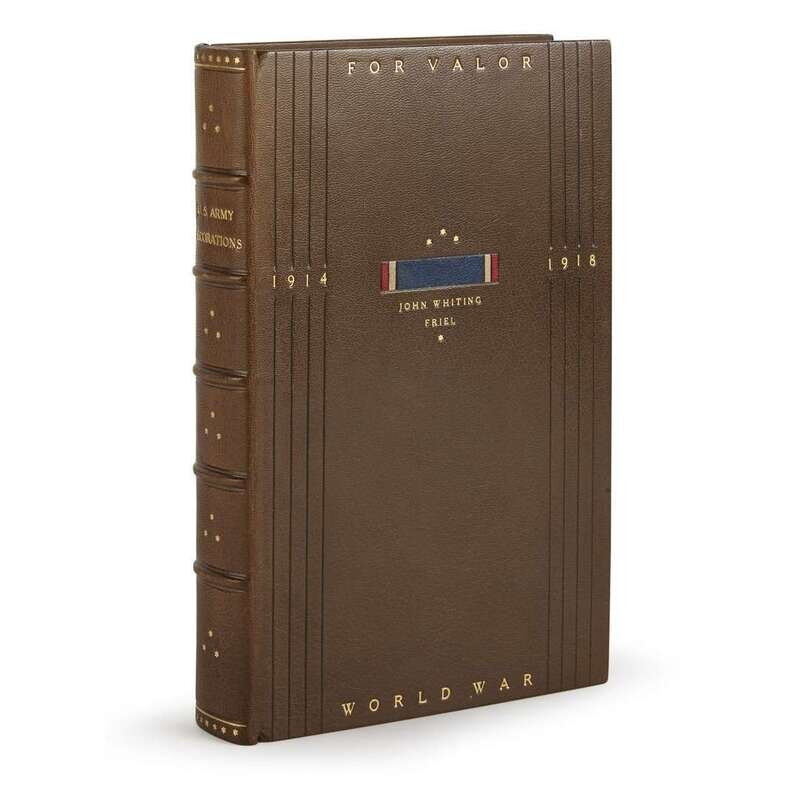 Washington: United States Government Printing Office, 1927. First edition. 8vo. 845pp., plus 60pp. supplemental list of French croix de guerre awardees at rear. From the library of John Whiting Friel and Helen Otillie Friel, and with their Rockwell Kent designed book-plate on front paste-down. In Friel's custom full brown morroco binding; decoratively stamped in blind and in gilt; inlay of the Distinguished Service Cross at center; all edges gilt; marbled endpapers. Scattered notation in pencil. Near-fine/ Fine condition.