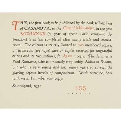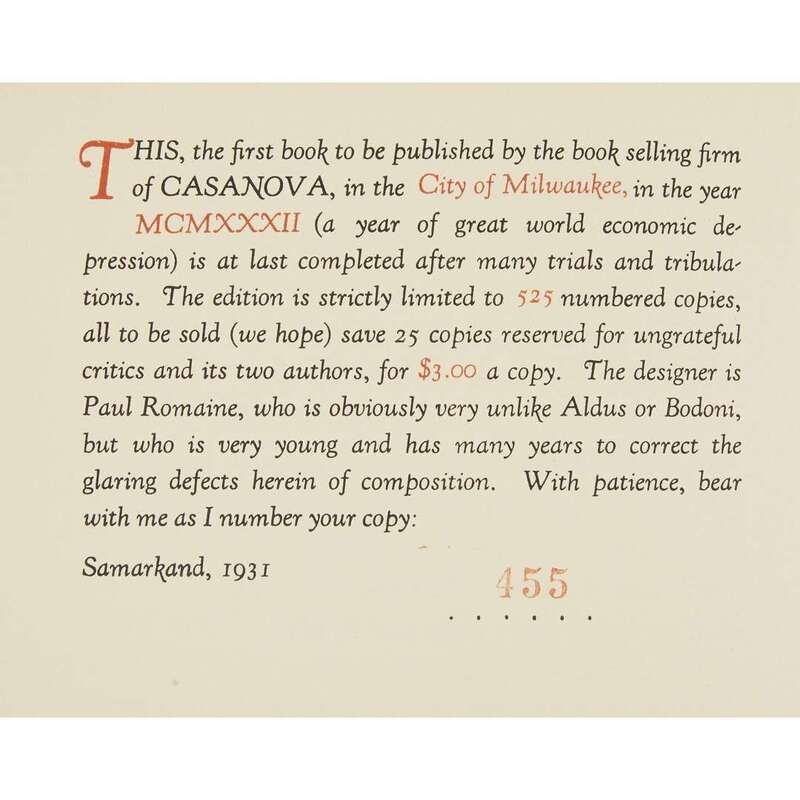 Milwaukee: The Casanova Press, 1932. First edition, number 455 of 525 numbered copies. Illustrated with a tipped in frontispiece protrait of the author. Publisher's stiff paper wrappers printed in black and red, spine lightly worn; fore edge untrimmed; in the publisher's dark red paper slipcase, extremities worn with some fading and dampstaining. Hanneman B11.