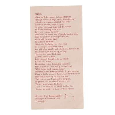 Stonington, Connecticut, 1959. Broadside, 3.5 x 7 inches. Unnumbered copy of 180 signed by Merrill in red at bottom. Pink wove paper; lettered in red, some light soiling to the top and bottom recto.