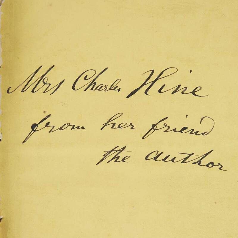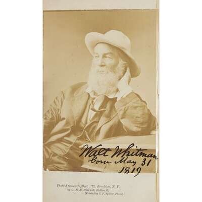 Camden, New Jersey: Author's edition, 1876. First edition, second printing. 8vo. Inscribed by Whitman on what appears to be the original front free endpaper from the original binding, "Mrs Charles Hine/ from her friend/ the author." Additionally signed by Whitman on albumen portrait frontispeice, as issued. With an additional blank leaf between "As a Strong Bird on Pinions Free" and "Memoranda During War", not stated in BAL. Later full blue straight-grain morocco; stamped in gilt; top edge gilt, other edges trimmed; marbled endpapers. Small tears to top and bottom gutter of frontispeice leaf; chipping to gutter edge of albumen print; scattered chipping to fore-edge of text; several quires toned. BAL 21413.