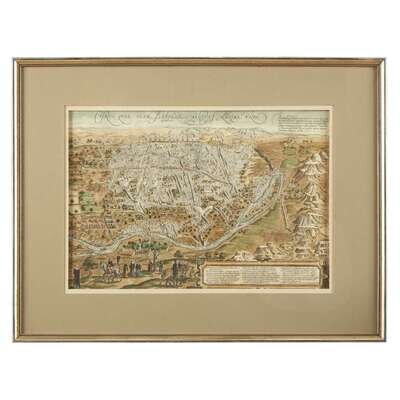 (Cologne), (1572-1624). Engraved map, in old hand-color. Likely washed, lightly creased, minor soiling, glue residue on center fold verso, Latin text printed to same. 13 1/16 x 19 1/8 in. (33 x 48cm). Hinge mounted and framed.