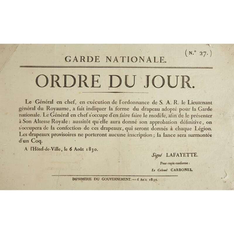 (Paris), August 6, 1830. Letterpress Broadside with letterpress signature. Oblong folio. Evenly toned, scattered minor paper faults, tape repairs on verso.