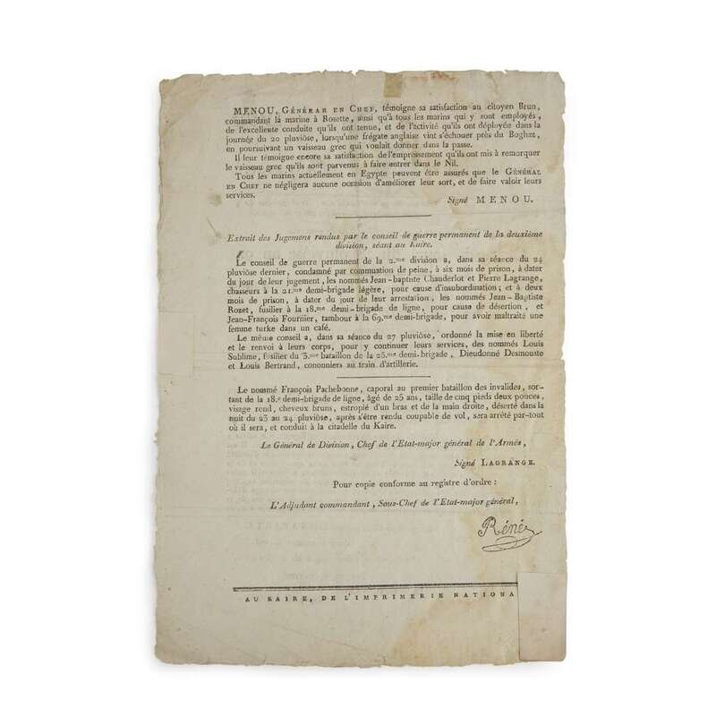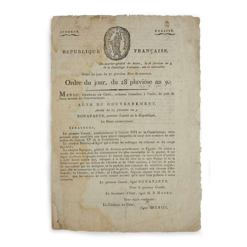 Cairo: L’Imprimerie Nationa[le], February 17, 1801. 2pp. Order du Jour, du 28 pluviose an 9., with the letterpress signature of Bonaparte as Le premier Consul. Some dampstaining and soiling, occasional creasing, chipping along edges, repair to bottom verso.
