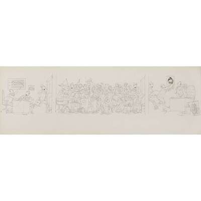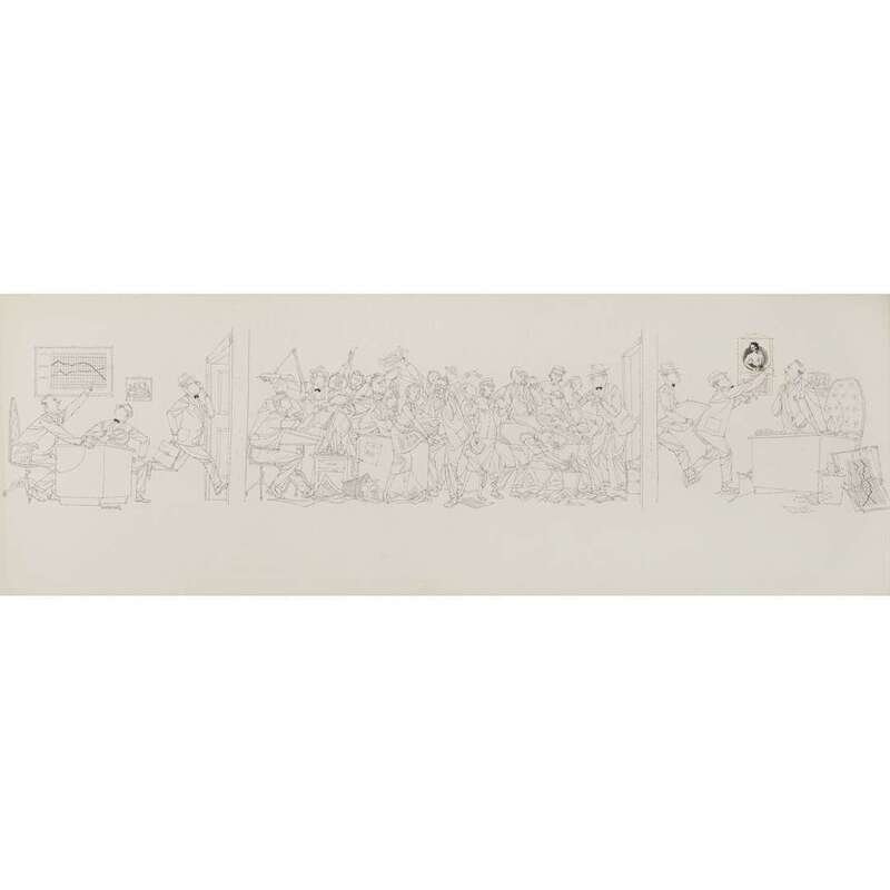 Pen and ink drawing with collage. Sometime mid 20th century. 11 5/8 x 33 ¼ (29 x 84 cm) (sight). Unexamined out of frame.