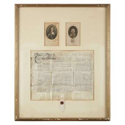 (England), March 21, 1681. 1p. Folio on vellum. With wax seal. Creasing along old folds, a few small separations. Signature browned but clear and strong. 14 1/4 x 19 in. (360 x 482mm).