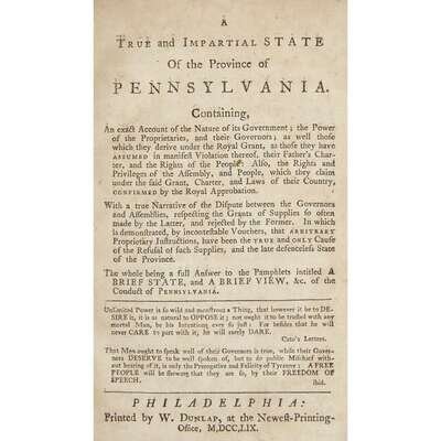 [Philadelphia & Environs] (Galloway, Joseph) A True and Impartial State Of the Province of Pennsylvania