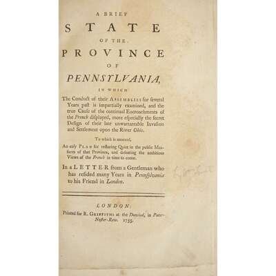 [Philadelphia & Environs] (Smith, William) A Brief State of the Province of Pennsylvania, I'm which The Conduct of their Assemblies for several Years past is impartially examined, and the cause of the continual Encroachments of the French d...