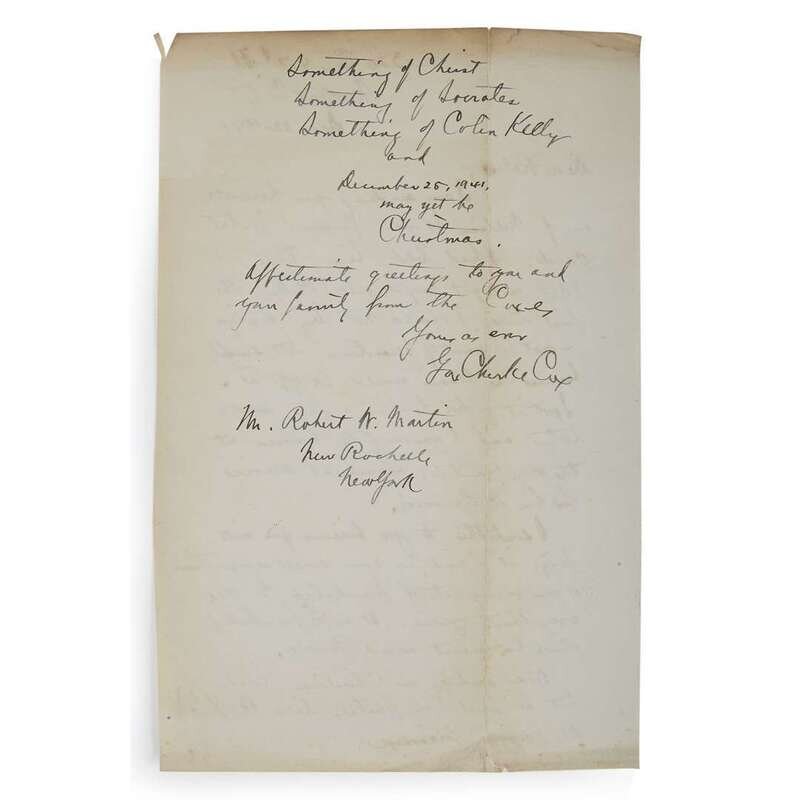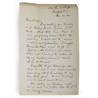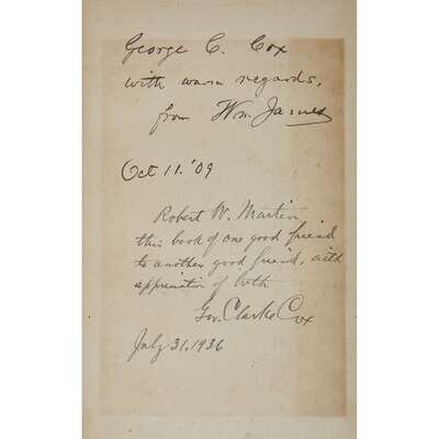New York: Longmans, Green and Co., 1909. First edition, first printing. 8vo. Presentation copy, inscribed to front free endpaper in the month of publication: "George C. Cox / with warm regards, / from Wm. James / Oct 11. '09". Publisher's quarter green cloth over gray-green boards, white paper spine label, spine toned with some wear to ends, paper label darkened and rubbed; portrait of James clipped from a newspaper laid on to front paste-down, some offsetting to front free endpaper; interior tight and clean. With a gift inscription from George Cox to Robert W. Martin dated 1936 and additional letter from Cox to Martin laid in dated 1941.