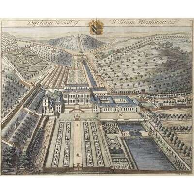 Plate 18; Dyrham the Seat of William Blathwait Esq, from Brittania Illustrata (1707-1726). Hand-colored engraving.