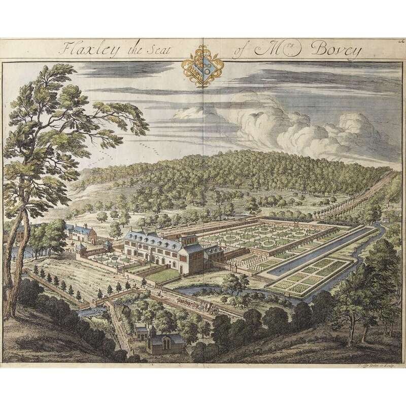 Plate 22; Flaxley the Seat of Mrs. Bovey, from Brittania Illustrata (1707-1726). Hand-colored engraving.