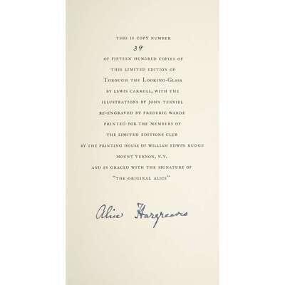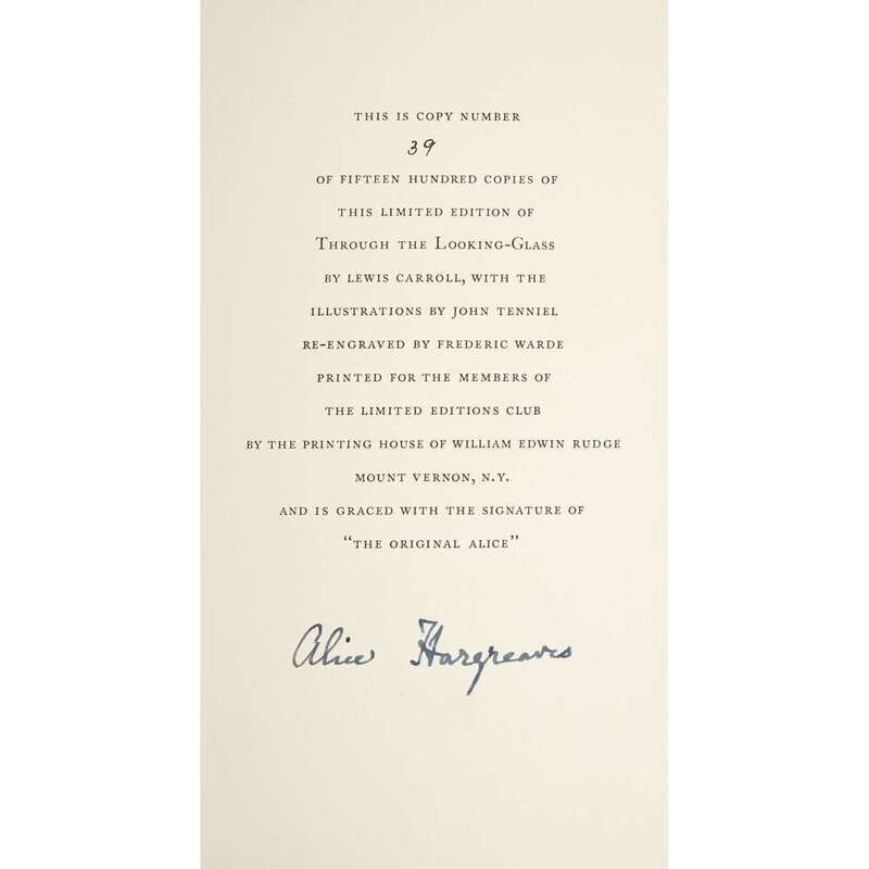 New York: The Limited Editions Club, 1935. First and limited edition, #39/1500 copies signed by Alice Hargreaves. 8vo. (213)pp. Illustrated by John Tenniel. Publisher's deep blue calf, spine worn and sunned, bottom front cover corner lightly rubbed; richly decorated in gilt; all edges in gilt; in original red cloth slipcase. Included: Vail, R.W.G. Alice in Wonderland, The Manuscript and its Story. New York, 1928. 12mo. 8pp. Limp paper wrapper; lettered in red. With the ex-library stamp of Bradford Willard on front cover. Very lightly worn and toned.