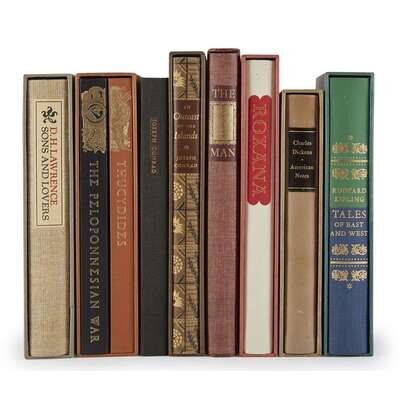 1. Wells, H. G. The Invisible Man. 1967. Illustrated by Charles Mozley. 2. Kipling, Rudyard. Tales of East and West. 1973. Illustrated by Charles Raymond. 3. Crawley, Richard. Thucydides and The History of the Peloponnesian War. 1974. Illustrated by A. Tassos. 4. Dickens, Charles. American Notes. 1975. Illustrated by Raymond F. Houlihan. 5. Conrad, Joseph. An Outcast of the Islands. 1975. Illustrated by Robert Shore 6. Lawrence, D. H. Sons and Lovers. 1975. Illustrated by Sheila Robinson. Publisher's bindings; in the original slipcases. About fine. 7. Defoe, Daniel. Roxana. 1976. Illustrated by Bernd Kroeber. 8. Conrad, Joseph. The Secret Sharer. 1985. Illustrated by Bruce Chandler.