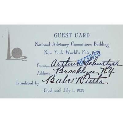 3 x 5 in. Teal-gray card printed in navy blue and silver. Guest card, presumably for entrance into the National Advisory Committee Building at the 1939 New York World's Fair. The card is filled out in black ink to Arthur Schurtzer of Brooklyn, N.Y. and signed by baseball legend Babe Ruth, all in Ruth's hand. "Received" is rubber-stamped in blue ink on the recto and there are two pin holes in the upper left corner of same, presumably left by a now-departed staple. A fine example of the card and a bold and still very bright signature of the Babe.