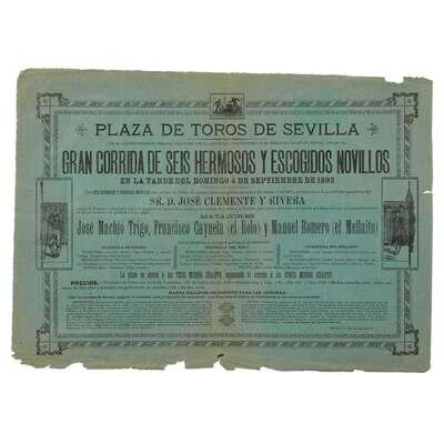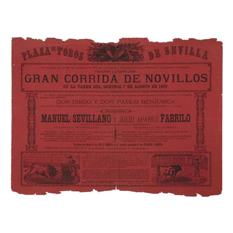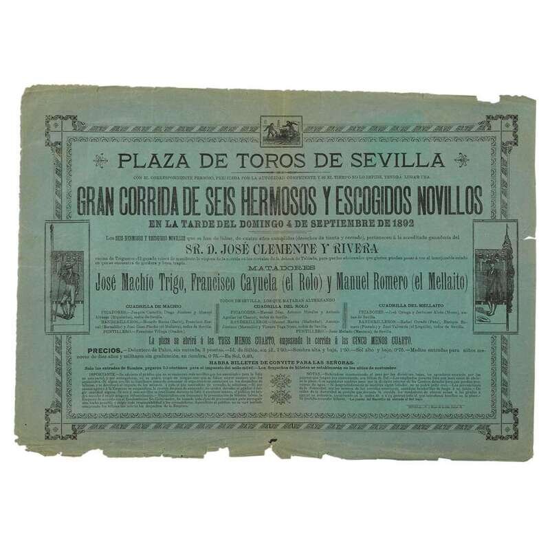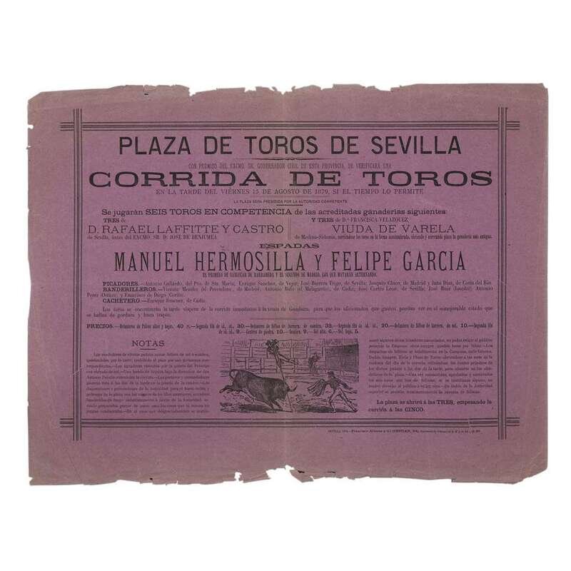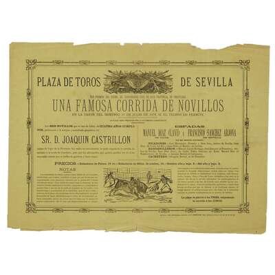 Seville, Spain, 1879-1892. Original printed broadsides for bullfighting matches at the Plaza de Toros de Sevilla. Variously printed on yellow, purple, red, and green paper; scattered closed tears and chipping to edges of each sheet; each repaired with tape on verso; each with scattered minor soiling and discoloration. Each sheet approxiamtely 12 1/4 x 17 1/4 in. (31 x 44cm).