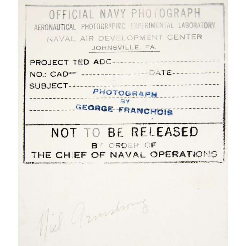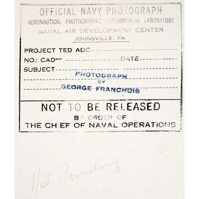 Gelatin silver print Ca. early 1960s; "Official Navy Photograph/Aeronautical Photographic Experimental Laboratory/Naval Air Development Center/Johnsville, PA" and "Photograph by George Franchois" rubber-stamped on verso. "Armstrong" in biro on recto, lower left margin. 10 x 8 in.