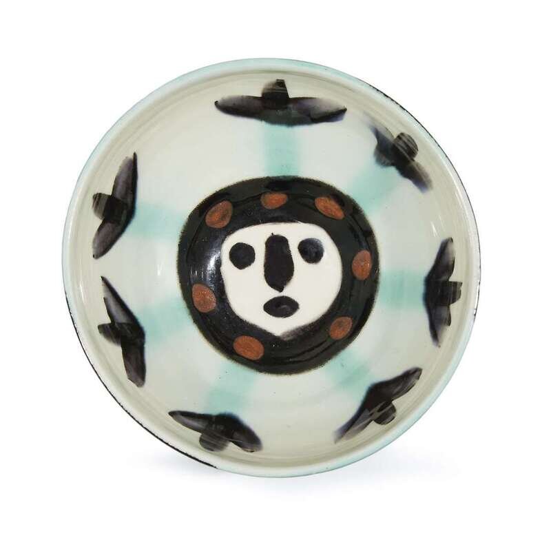 1955, from the edition of 500, incised 'EDITION PICASSO' and 'MADOURA' on the underside. White earthenware clay turned round cupel with decoration in engobes under glaze.