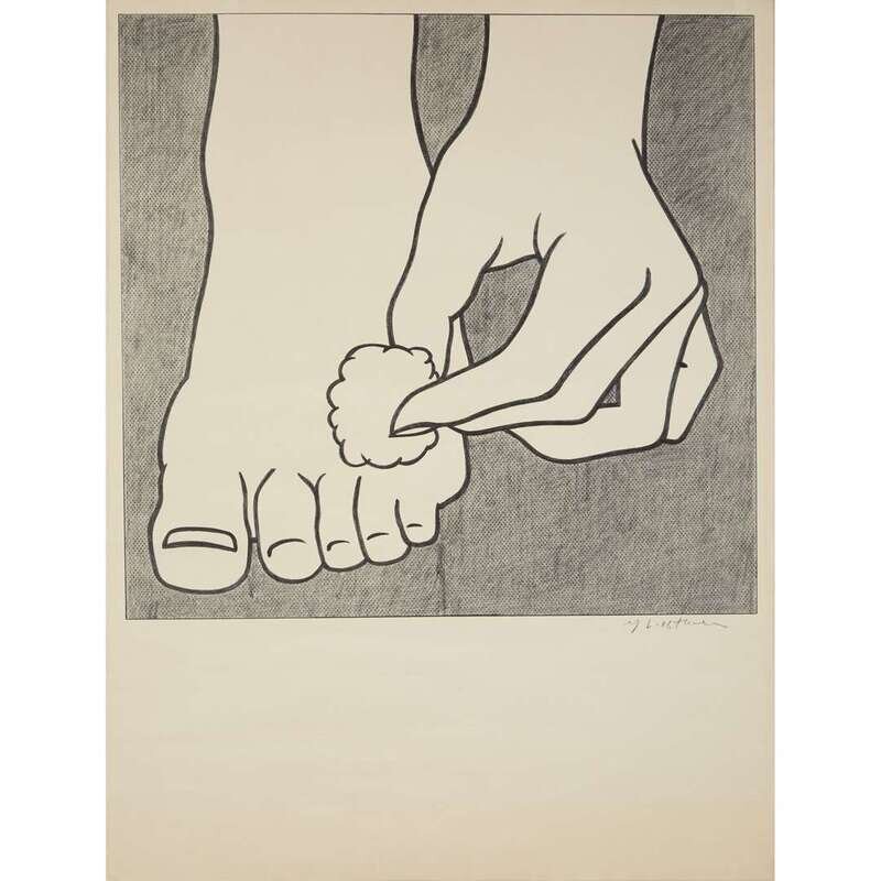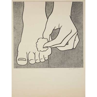 Foot Medication Poster is one of many signed graphic works in Bob’s collection which were initially created as exhibition flyers, posters or giveaways. The present work was created to advertise a group drawing show at Leo Castelli Gallery in 1963 which also included works by Lee Bontecou, Nassos Daphis, Jasper Johns, Robert Rauschenberg, Frank Stella, Jack Tworkov, and Gerald van de Wiele.