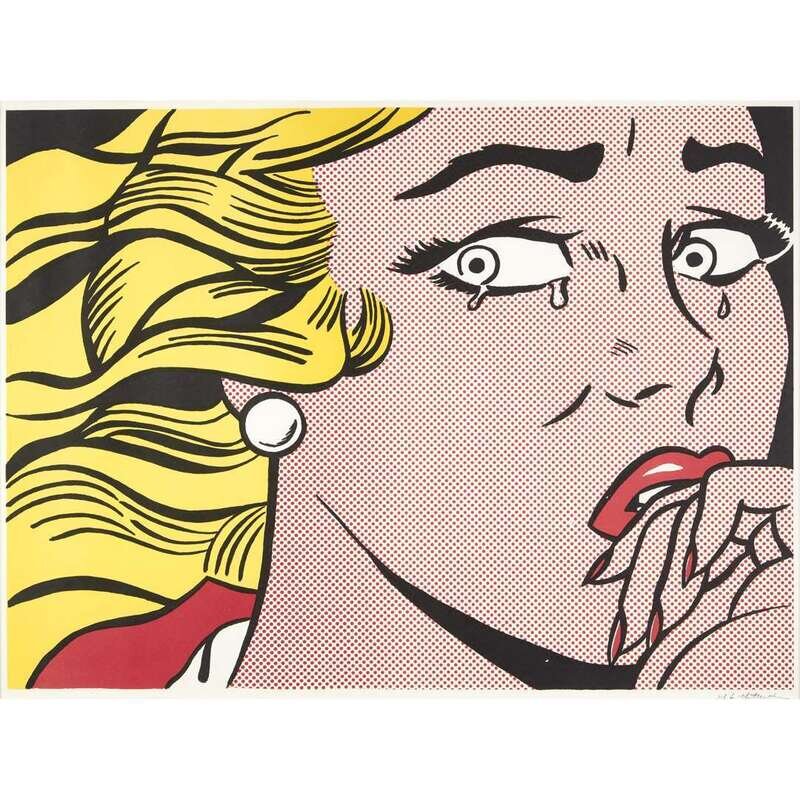 Crying Girl is one of Lichtenstein's earliest Pop Art prints and employs several of the quintessential elements which soon defined his exploration of this new genre. The image of a woman locked in a dramatic moment taken from or inspired by serials, cartoons and the like was one the artist explored repeatedly in the early 1960's, and highlights the often hyper-stylized treatment of women in graphics in that era. The cropped image here necessitates a closer look at the building blocks of print itself -- benday dots - which, set against primary colors, black, and white became the defining visual language of Lichtenstein's work. Crying Girl was created to announce Lichtenstein's exhibition at Leo Castelli Gallery which began in September of 1963. Copies without the printed text (such as the present example) were sold and given away during the exhibition, and may be when Bob acquired this important print.