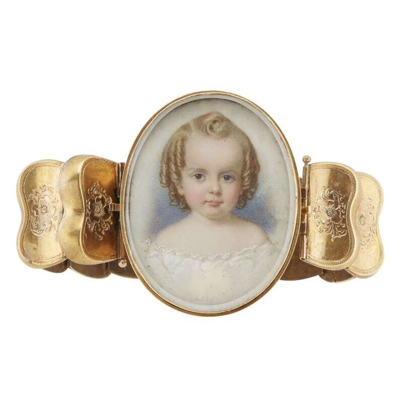Gilt bracelet with portrait miniature clasp of a young girl, circa 1840
