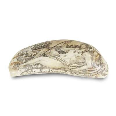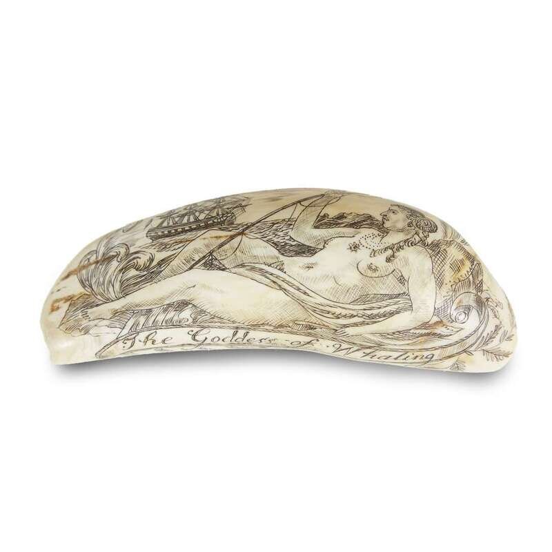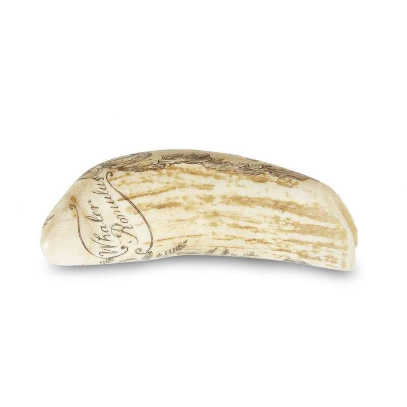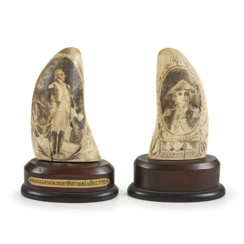 Both signed, "C. W. DeMontigny," the first decorated with standing figure of the Marquis de Lafayette, retains Christie's label on verso; the second decorated with a portrait of John Paul Jones, mounted on mahogany bases; together with a smaller tooth decorated with the "Goddess of Whalers", and the "Whaler Romulus".