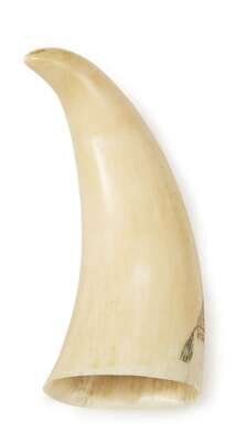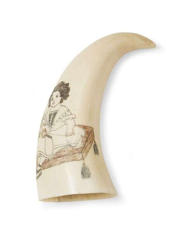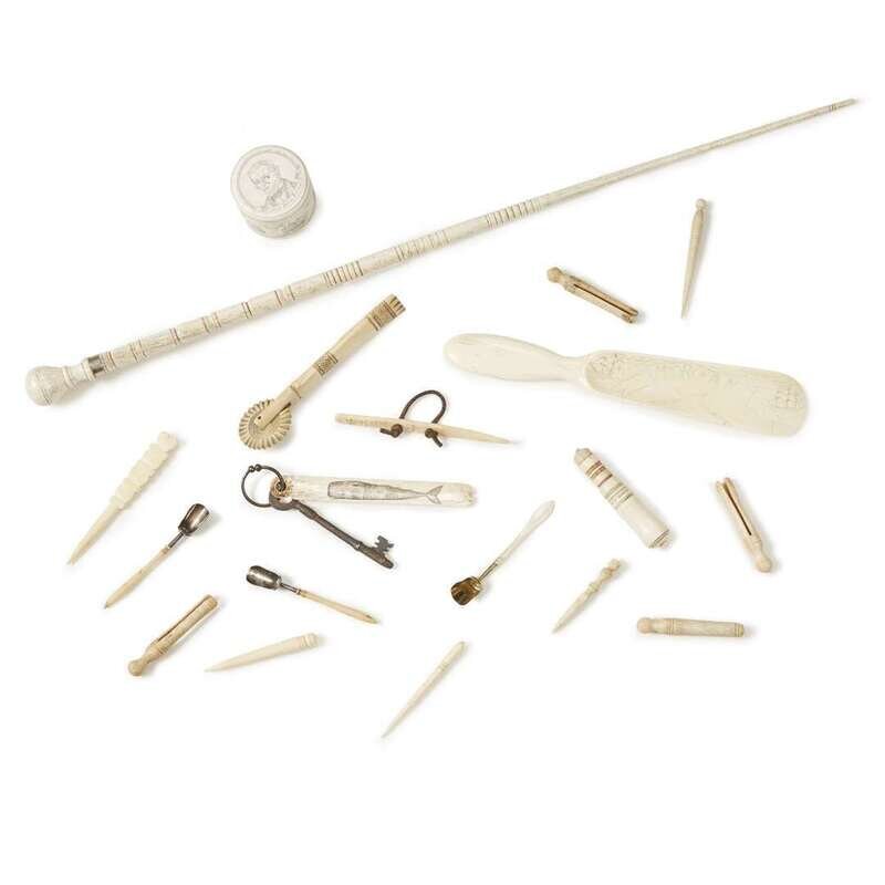 Comprising a carved shoehorn, a pointing stick, a key chain with key and fob; a round box, the lid inscribed "Captain Jared Jernegan" with his portrait, the sides decorated with ships and whalers, one ship labeled 'The "Roman"'; three small scoops; four clothes pins; six bodkins, one with leather strap and inscribed "1856"; a pie crimper; and a whale tooth decorated with a young girl holding a doll.