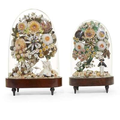 Two Victorian shellwork centerpieces under glass cloches mid-19th century