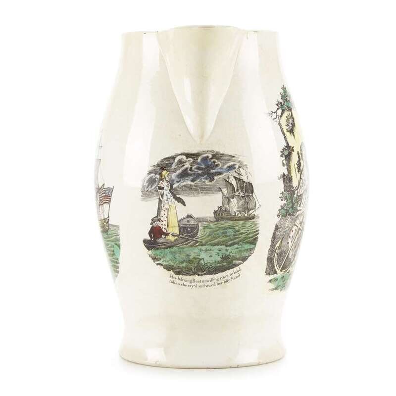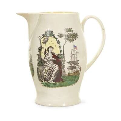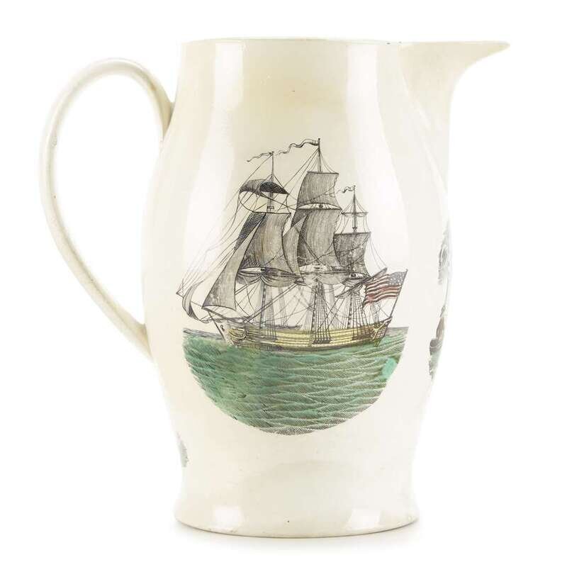 Large transfer-decorated and polychrome enameled creamware presentation jug Liverpool, England, circa 1800