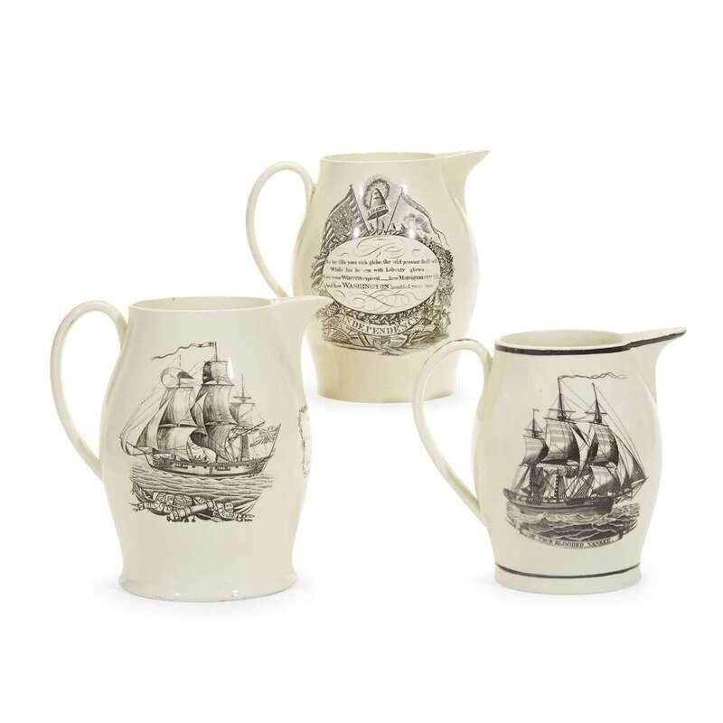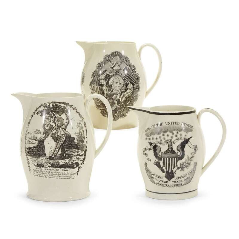 Three transfer-decorated and enameled creamware presentation jugs Liverpool, England, circa 1800