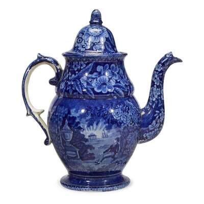 Historical Blue Staffordshire 'Lafayette at the Tomb of Franklin' coffeepot Thomas Mayer, Stoke, Cliff Bank Works, 1829