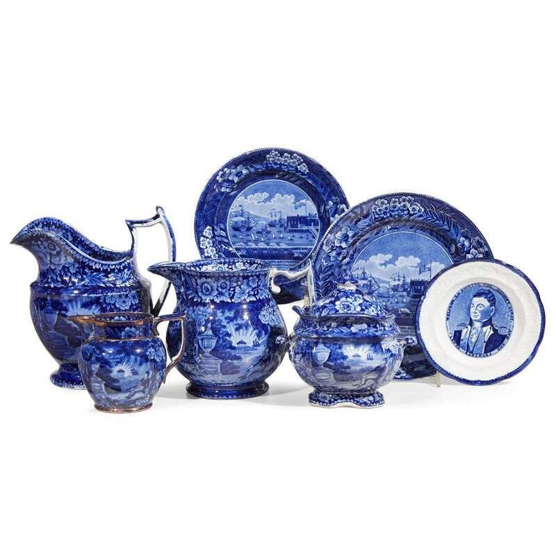 Including two pitchers, a creamer with copper lustre highlights and a covered sugar decorated with 'Lafayette at the Tomb of Franklin,' two plates decorated with 'Landing of Lafayette,' and a small Lafayette portrait plate.