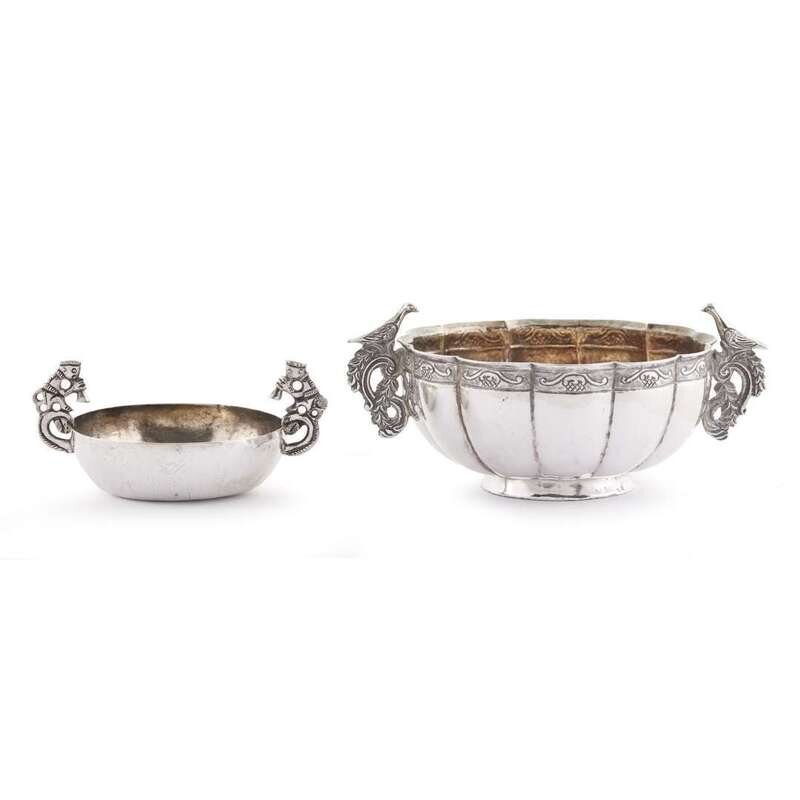 The footed example with lobed sides, registers with floral designs at rim, and handles in the form of birds on branches; the second example with handles in the form of Pre-Columbian figures.