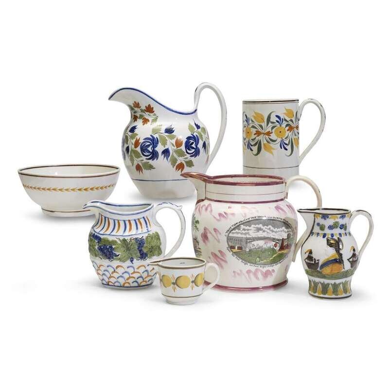 Comprising three pitchers, one with pink lustre and transfer-printed scene showing the Bridge over River Wear built by R. Burdon between 1793-1796; two creamers, one with molded and painted memorial to Admiral Duncan (1731-1804); a bowl decorated with pineapple plant to well; and a mug; most decorated with various foliage.