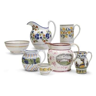Group of seven pieces of enamel-decorated Staffordshire pearlware and prattware English, late 18th/early 19th century